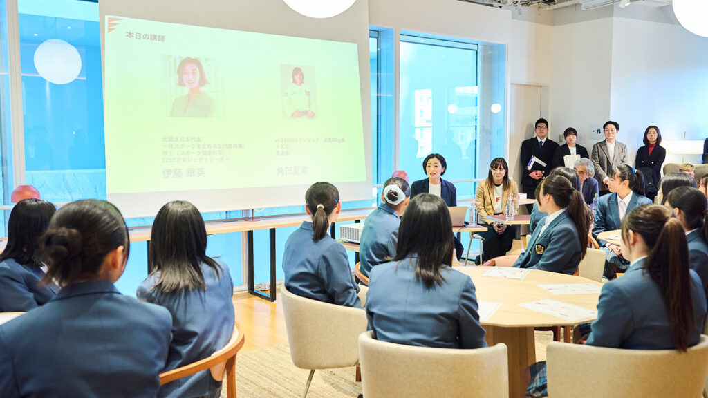 ワークショップにはスポーツを止めるな代表理事であり1252プロジェクトリーダーの伊藤華英、2024年パリオリンピック柔道女子48kg級金メダリストの角田夏実さんが登壇し、横浜市内の中学生・高校生となごやかな雰囲気のもとに実施されました。