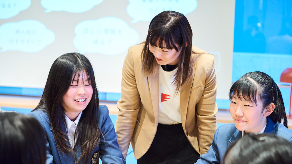 その後「1252 Clubroom Workshop!」としてクイズ形式でスポーツと生理の基礎知識を学びつつ、「生理の課題どんなものがありますか?どうやって解決する?~未来に向けて自分ができること~」をテーマにグループワークを行いました。グループワークでは角田さんも積極的に生徒に働きかけ、活発な議論が行われました。