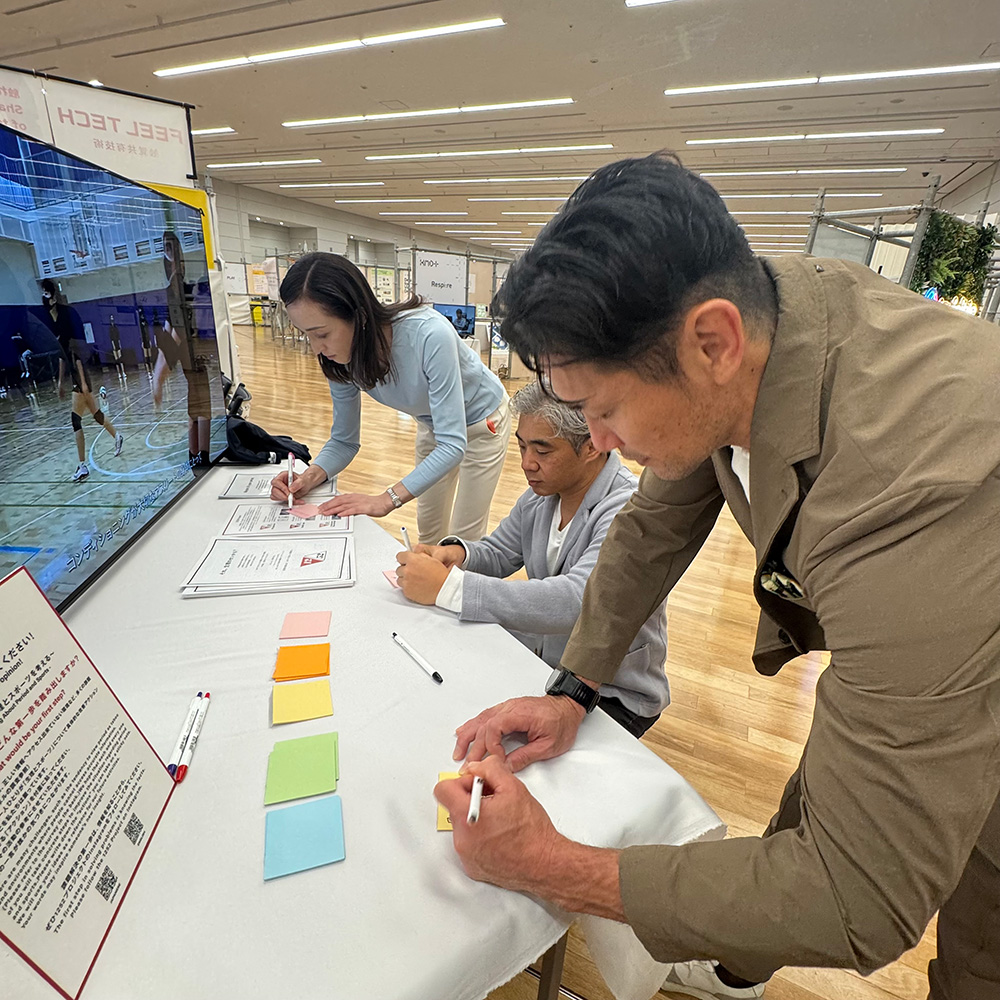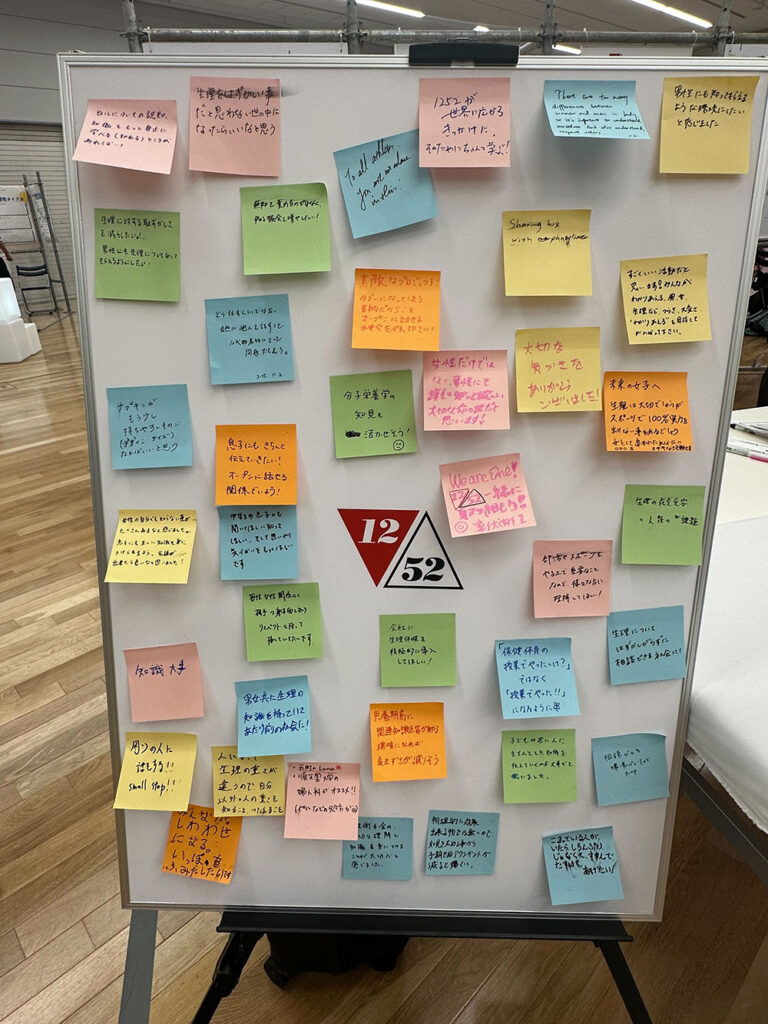 また来場者参加型の企画として、生理とスポーツの課題に対して、「あなたなら、どんな第一歩を踏み出しますか?」をテーマに、自由に付箋で意見を書いていただくコーナーも設置しました。